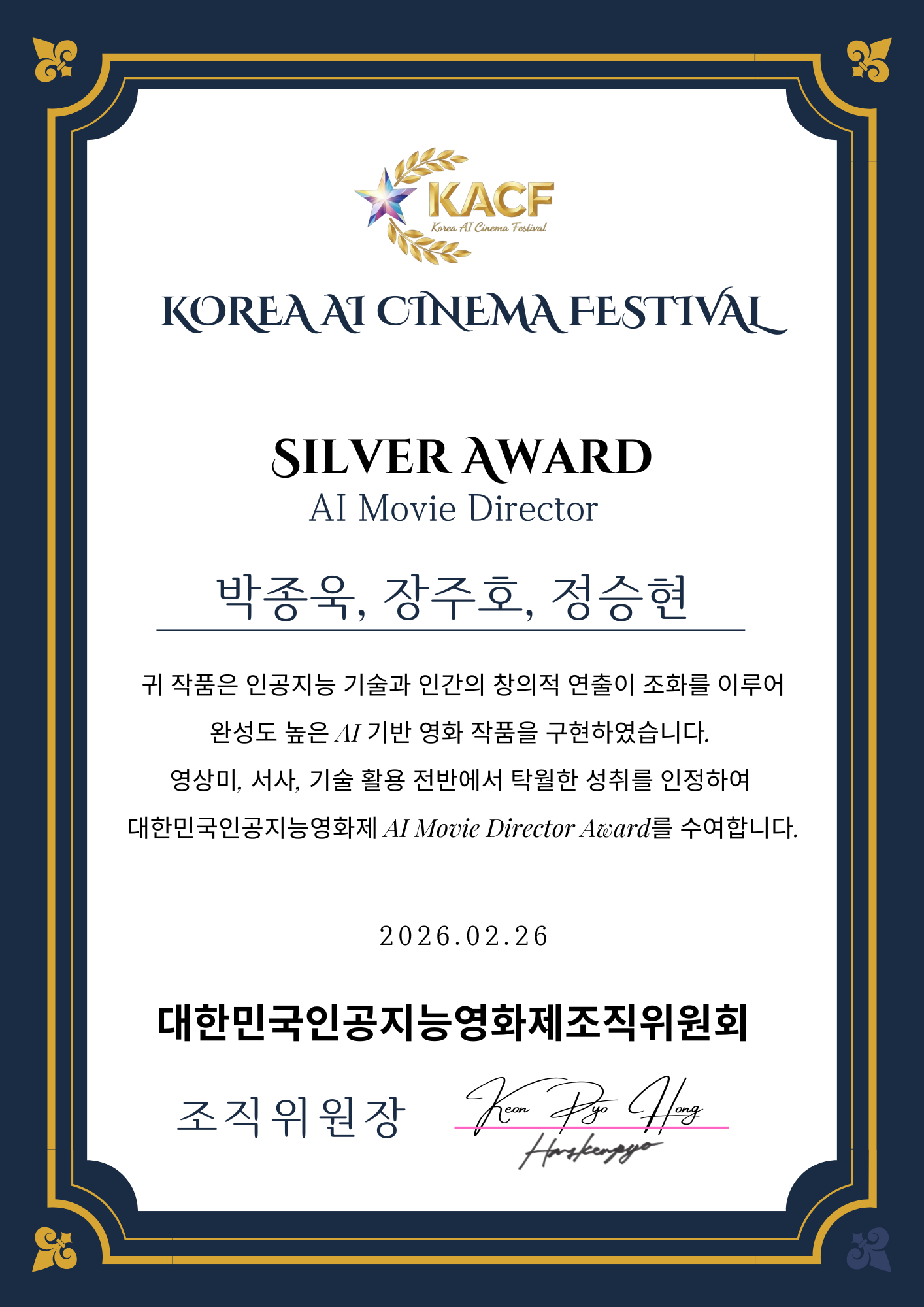 2026년 2월 25일-26일 개최된 제2회 대한민국인공지능영화제에서 AI Movie Director 부분 은상을 수상했습니다.