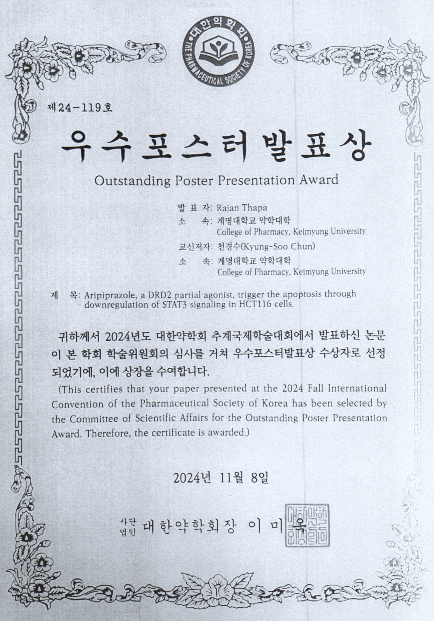 대한약학회에서 개최한 2024 추계국제학술대회에서 타파 라잔 학생이 우수포스터발표상을 수상하였음을 알려드립니다.