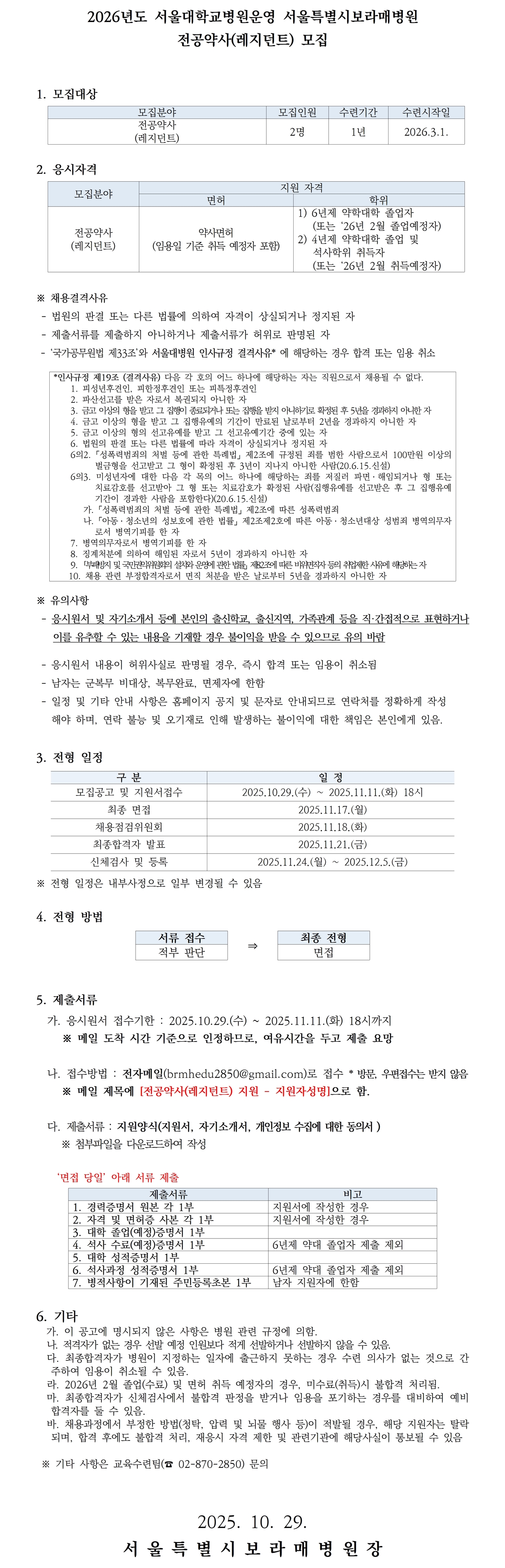 [보라매병원 약제부] 2026년도 전공약사(레지던트) 모집