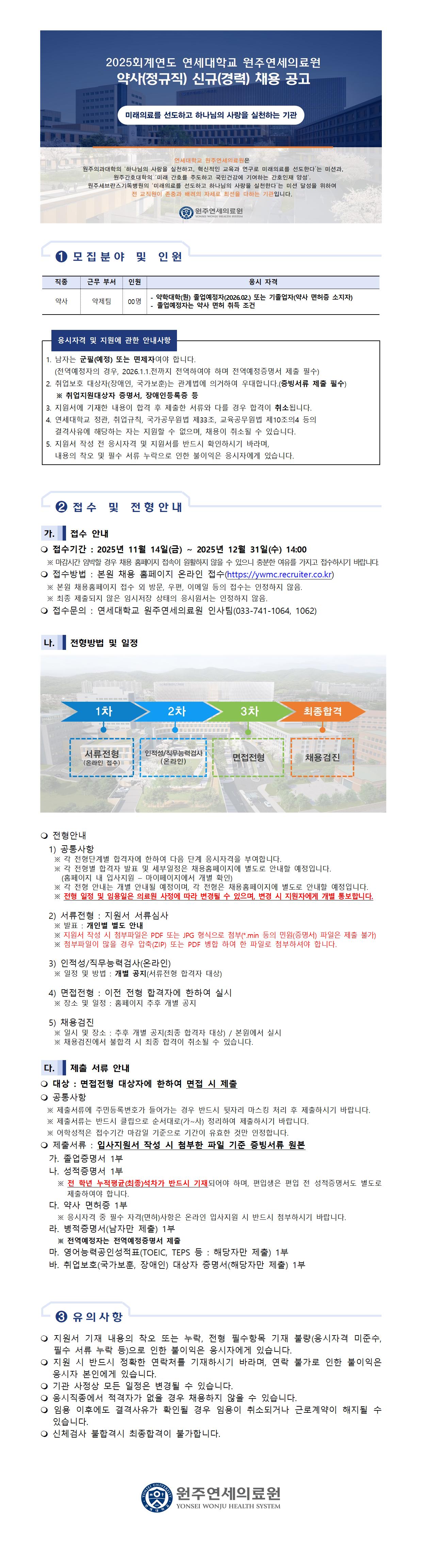 연세대학교 원주연세의료원 약사(정규직) 신규(경력) 채용 공고